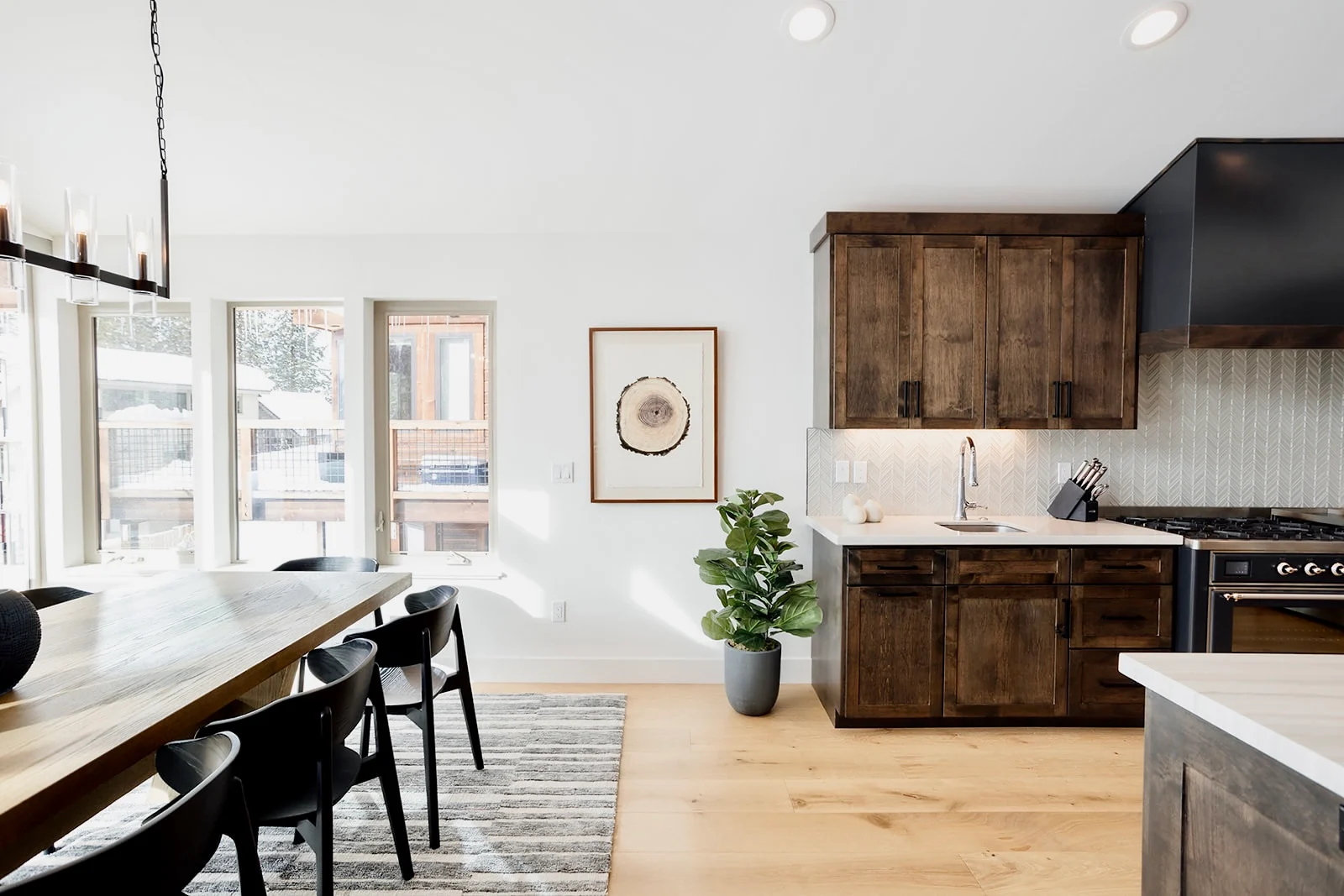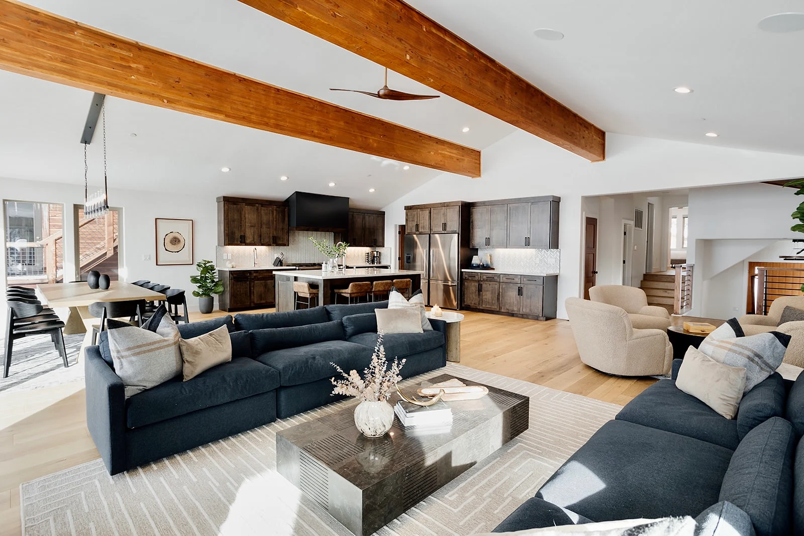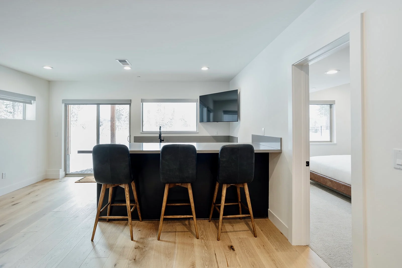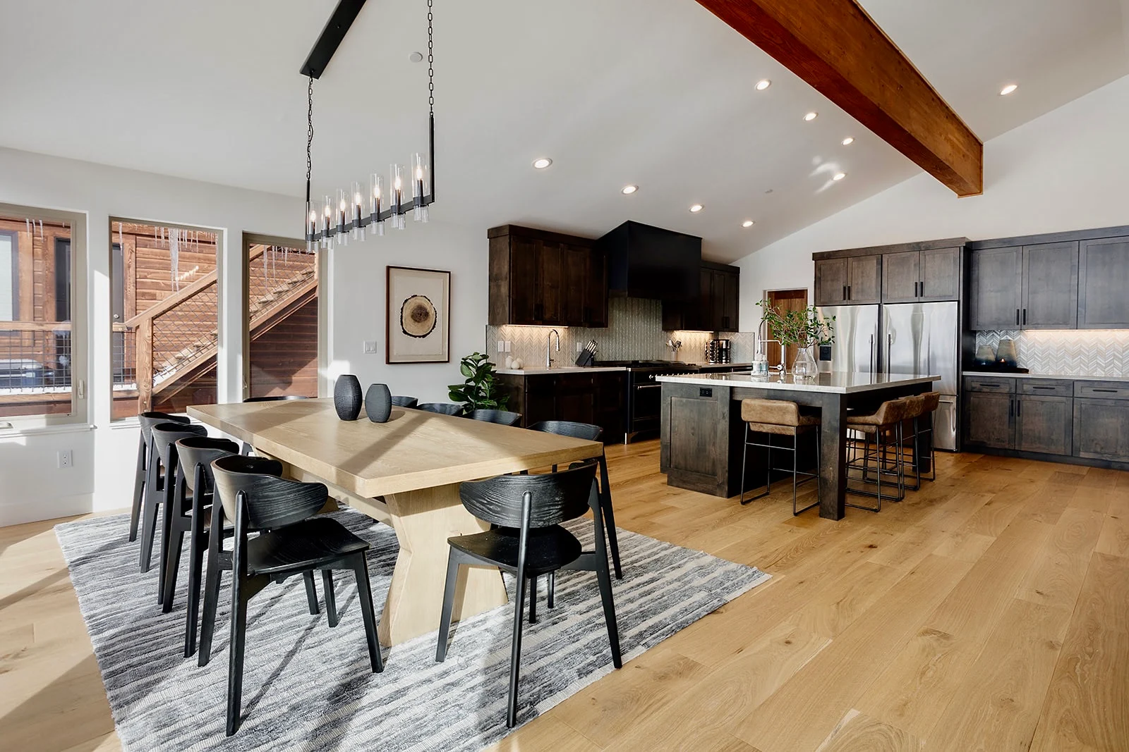 California boasts an uninterrupted view of Lake Tahoe over the meadows, from the backyard. The third-story hot tub is a perfect place to unwind and watch the sun set and the stary mountain sky rise. This is a new build property with exceptional design and architecture. The spacious great room on the main level is fitted with a wall of windows facing the lake offering the perfect back drop to your evening meal service.
