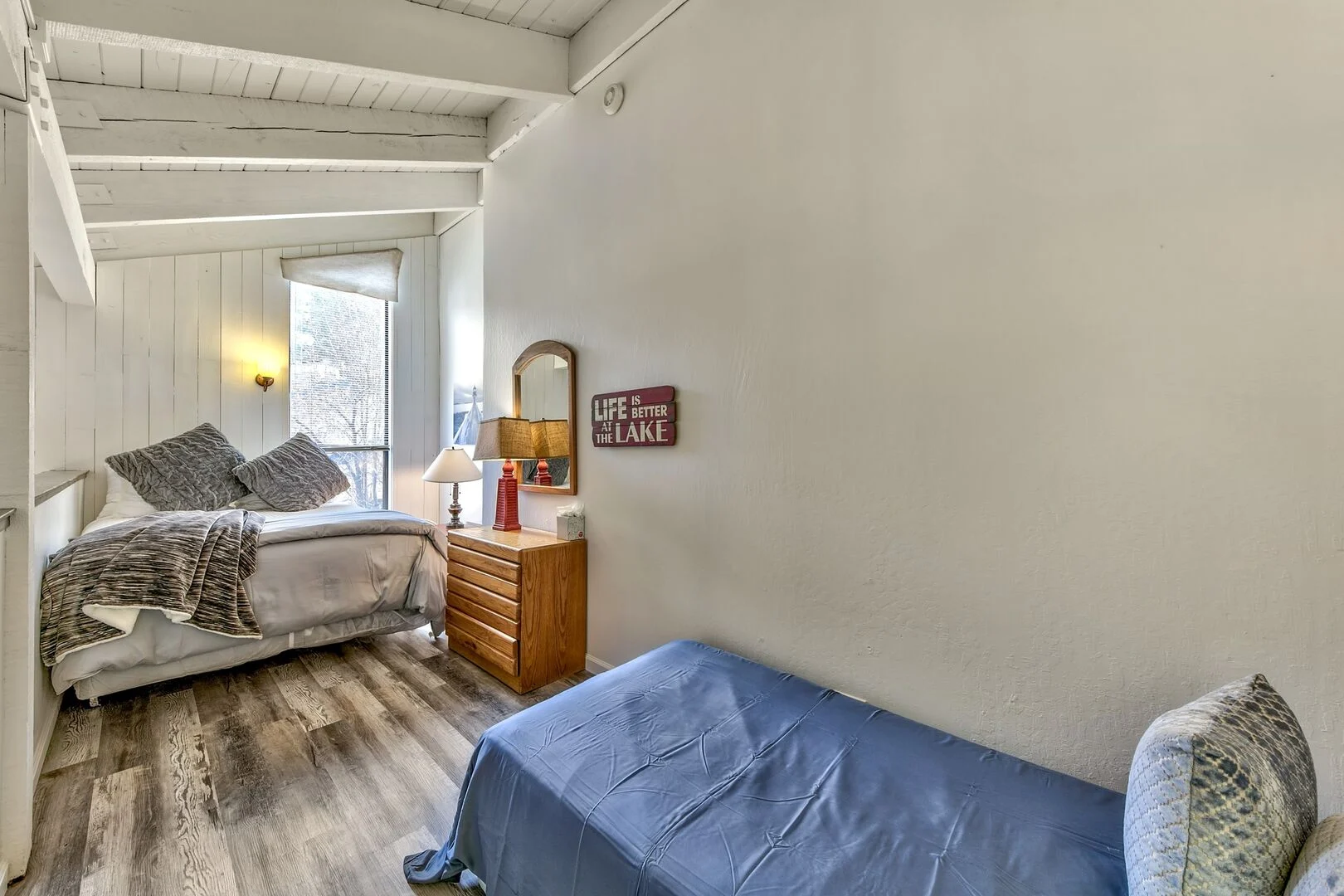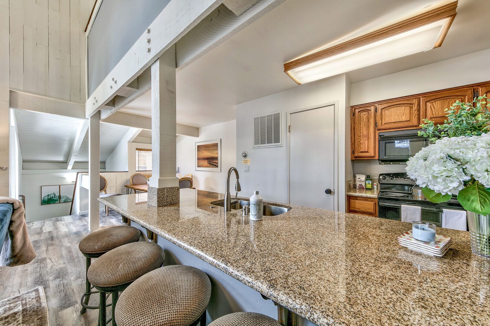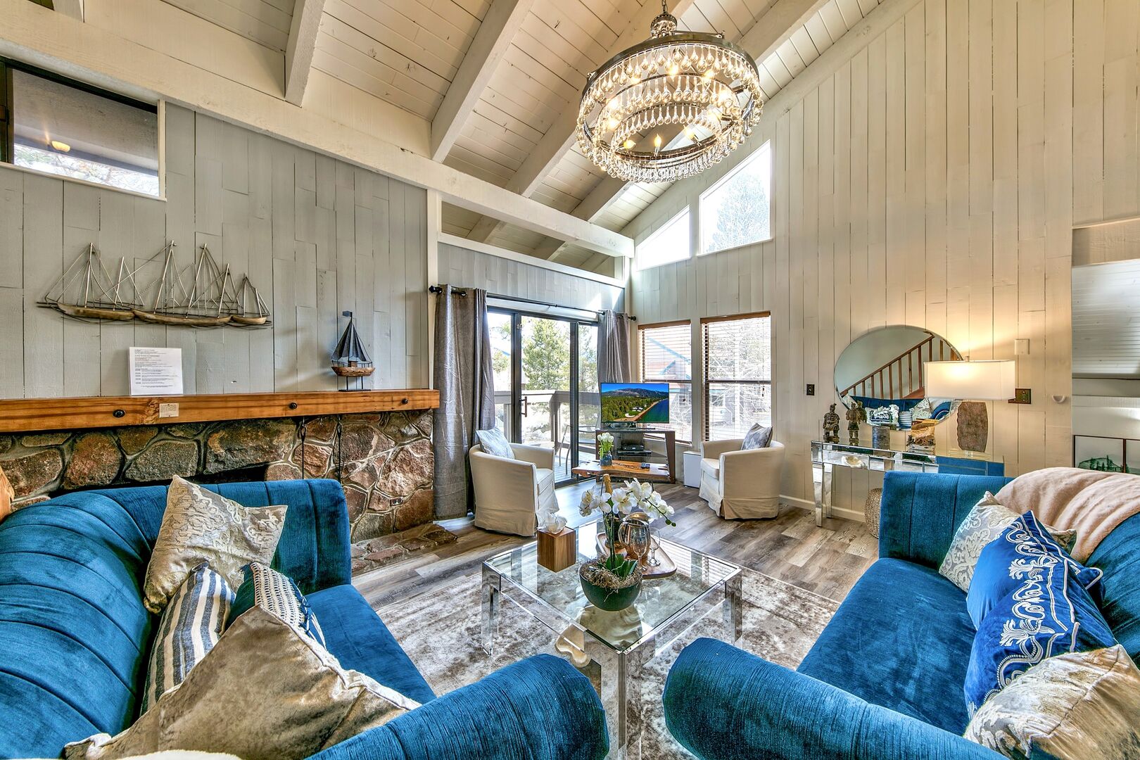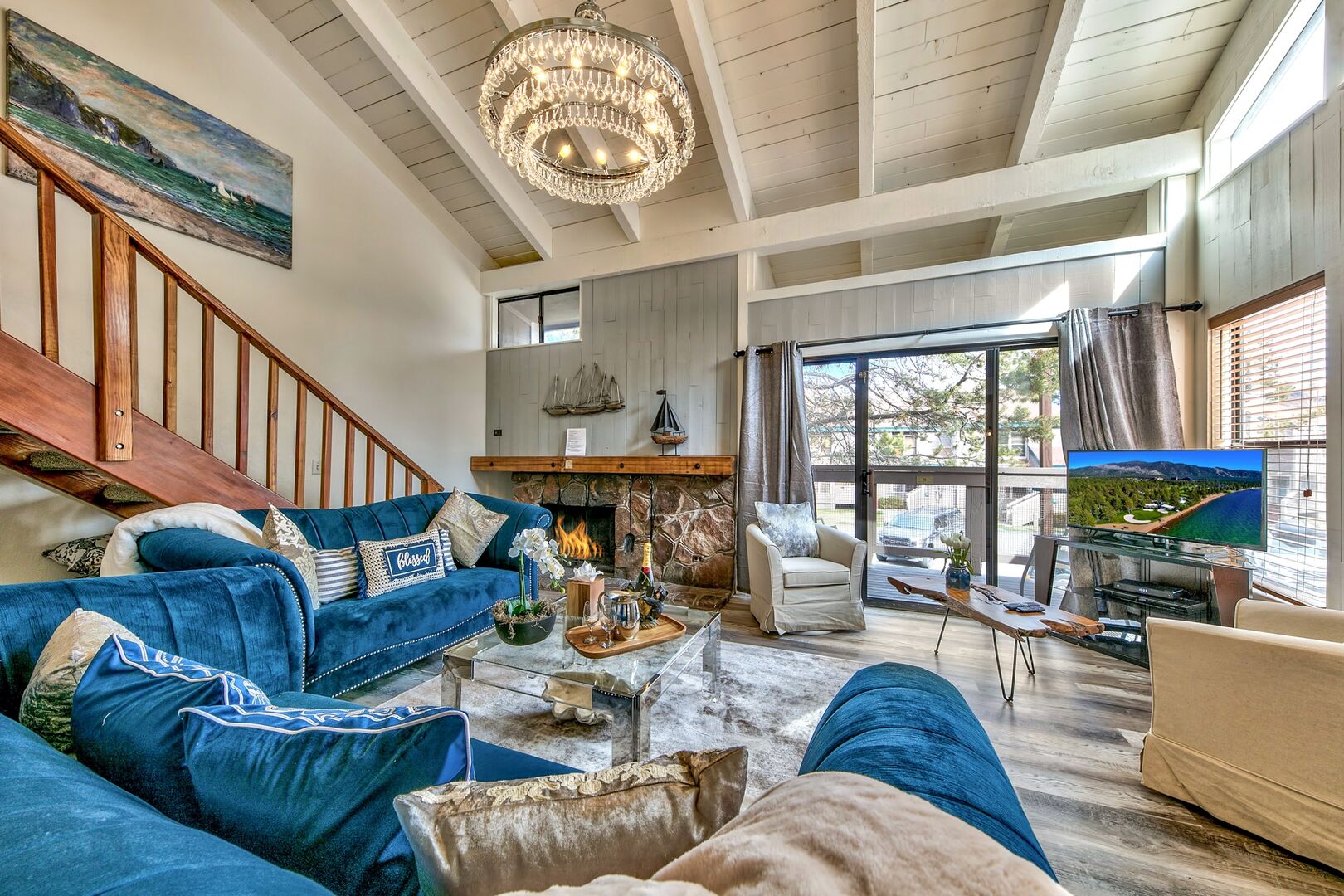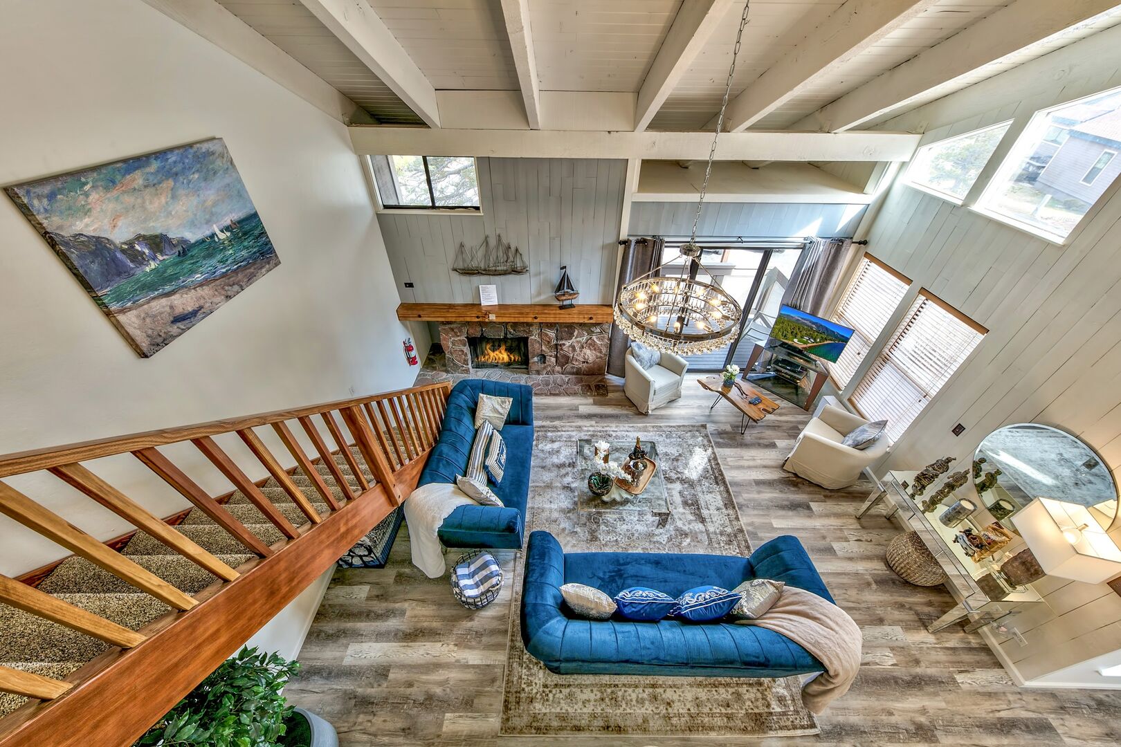 Just remodeled – the open plan living/dining/socializing area is overlooked by a mezzanine level that contains the bedrooms. Your evenings in can will be cozy and intimate as you relax in front of the fire and our staff deal with everything.