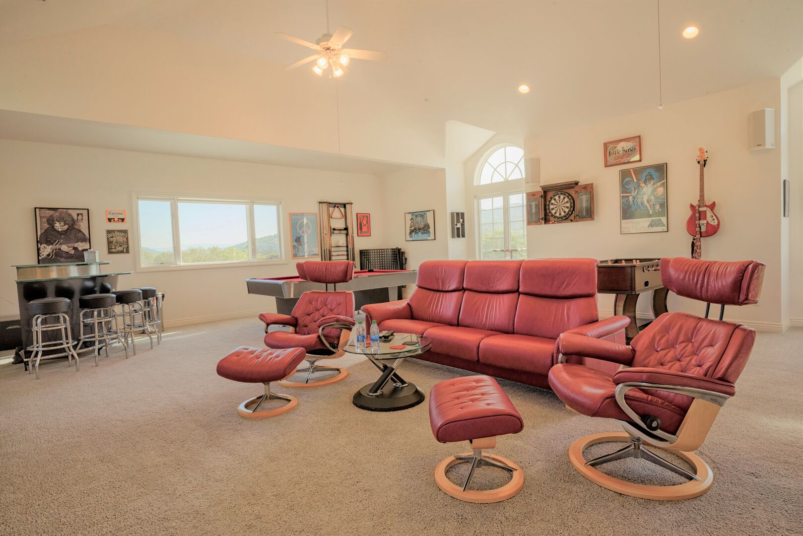 The interior features an open-concept design with soaring ceilings and high-end finishes flowing seamlessly into the inviting living and dining areas, making it ideal for both intimate gatherings and larger events. A cozy fireplace adds warmth to the living room, which opens to expansive outdoor spaces, perfect for enjoying the landscape and California’s mild climate.