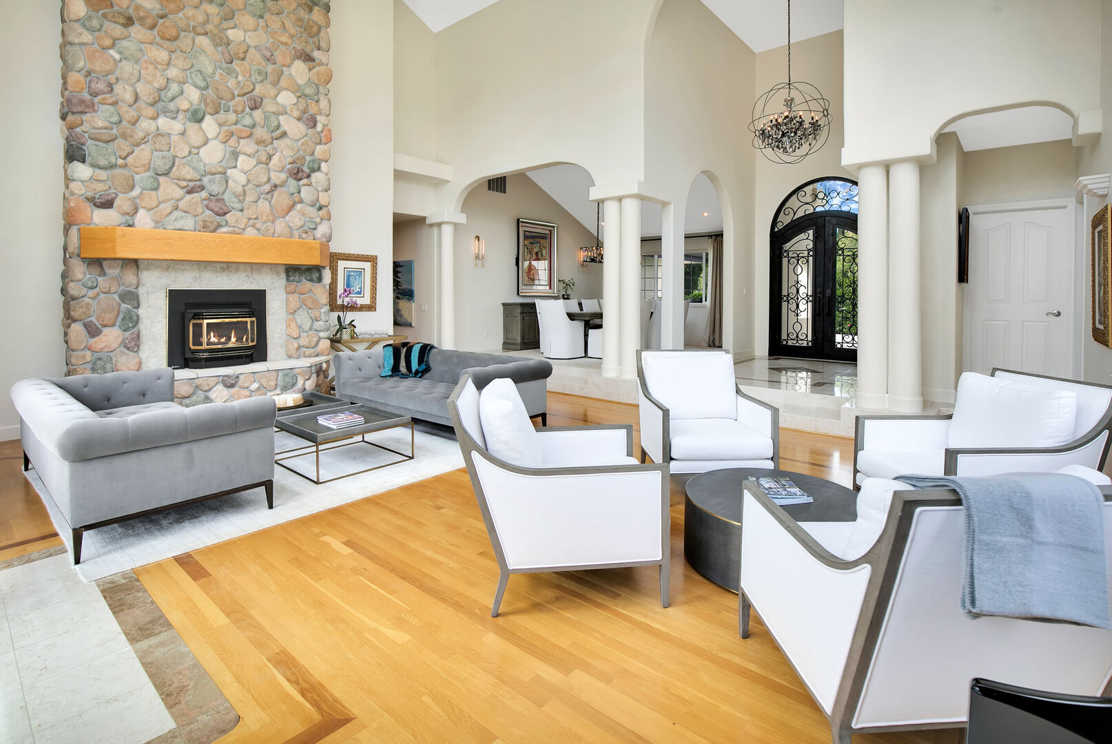 Upon entering, you’re welcomed by a spacious open-concept floor plan that flows effortlessly from one room to the next, with an abundance of natural light pouring through oversized windows. The large living room features soaring ceilings, a striking stone fireplace, and beautiful hardwood floors, creating an inviting space for both everyday living and elegant entertaining. This floor contains 2 bedrooms and 2 1/2 bathrooms.